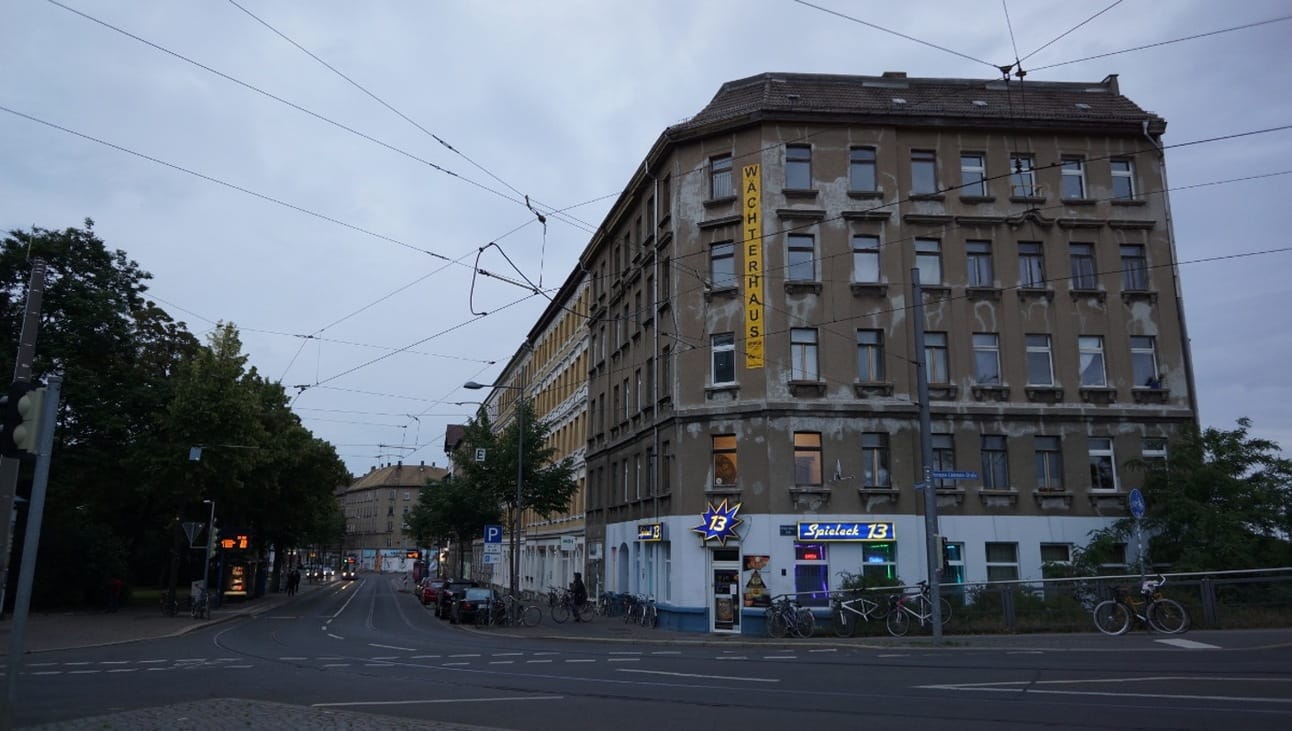 アイゼンバーン通りとヘルマン=リーブマン通りの交差点を北に進んで線路の上に架かる橋を越えると、ショーネフェルトという地区に入る。この地区の入り口である角の古いアパートの3階には、2022年末までkrudebudeというアートスペースが存在していた(今ではすっかりきれいなアパートに生まれ変わった)。